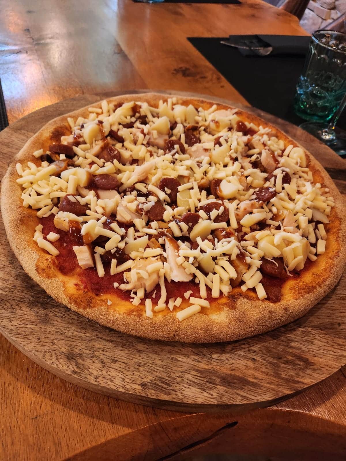 Tomate, Mozzarella, Olives, Émincé de Poulet, Champignons de Paris, Pointe de crème fraîche.